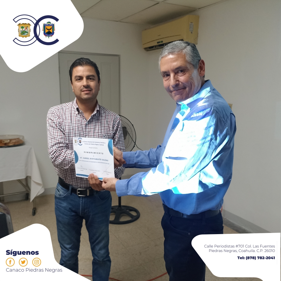 La Cámara Nacional de Comercio de Piedras Negras realizó la 6a. Sesión Ordinaria en las instalaciones del Hospital Civil, la reunión fue encabezada por el presidente Lic. Héctor Javier Rodríguez López y el Consejo Directivo donde se le otorgó el nombramiento al Lic. Gabriel Bustamante Salinas como Representante de Transportes Concesionados, posteriormente el Director del Hospital Civil el Dr. Oscar De La Garza se realizó una presentación de los directivos del hospital, las instalaciones y los servicios que presta el hospital civil a la ciudadanía.